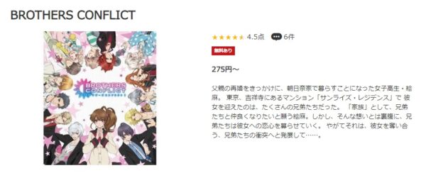 「BROTHERS CONFLICT」のアニメのレンタル料金は1話275円です。