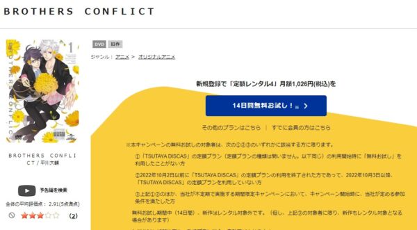 TSUTAYA DISCASは、準新作は8枚まで、話題作・旧作は枚数制限なしでお試し期間中に無料レンタルができ「BROTHERS CONFLICT」のアニメは、旧作なので無料視聴可能です。
