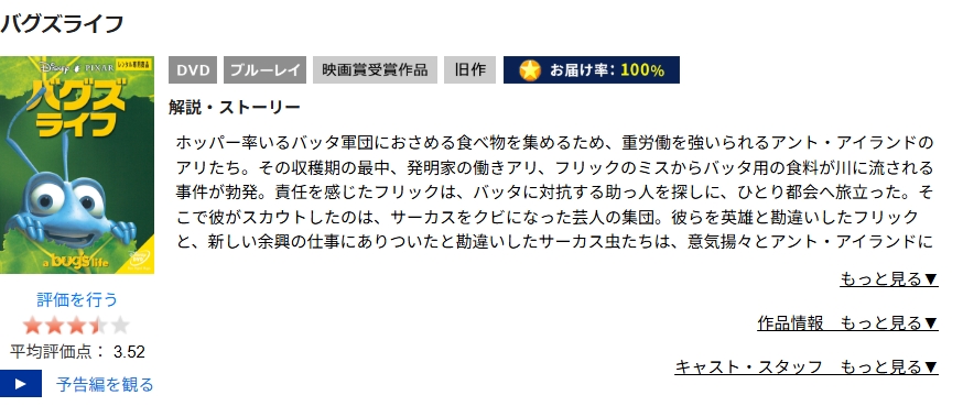 映画「バグズ・ライフ」は旧作なので、DVDレンタルすればフル視聴が可能です。