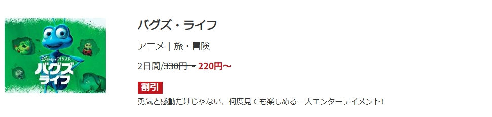 初回登録時に1,600円分のポイントがもらえるので、220ポイントでレンタル配信している映画「バグズ・ライフ」はフルで視聴できます。