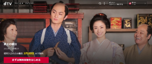 無料動画サイトと違って、初回特典のお試し無料期間があるので、「武士の献立」をフルで無料視聴することが可能です。