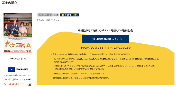 『TSUTAYA DISCAS』は14日間のお試し期間が初回特典で利用できるので「武士の献立」の動画をフルで無料視聴できますよ。