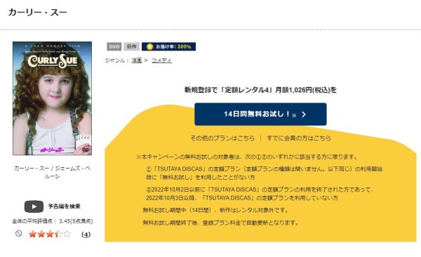 そして、映画「カーリー・スー」はツタヤディスカスで配信しているので、無料でDVDレンタルが可能です。