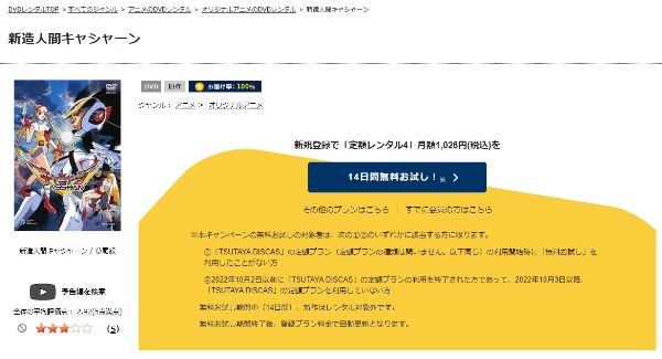TSUTAYA DISCASは、準新作は8枚まで、話題作・旧作は枚数制限なしでお試し期間中に無料レンタルができ「キャシャーン」のアニメは、旧作なので無料視聴可能です。