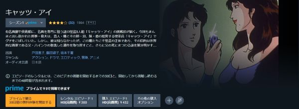 Amazonプライムでも、アニメ「キャッツ・アイ(1期)」は見放題で配信されており、30日間の無料期間があるので、余裕を持って「キャッツ・アイ(1期)」のアニメを全話視聴ができます。