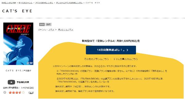 TSUTAYA DISCASは、準新作は8枚まで、話題作・旧作は枚数制限なしでお試し期間中に無料レンタルができ「キャッツ・アイ(1期)」のアニメは、旧作なので無料視聴可能です。