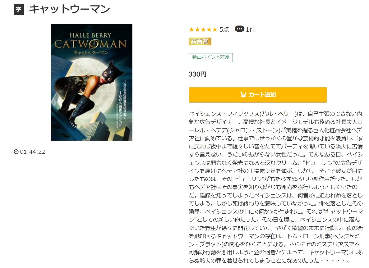music.jpは初回登録で1,600Ptが貰えるので「キャットウーマン」の映画を無料で見ることができます。