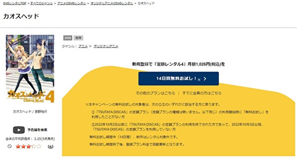 TSUTAYA DISCASは、準新作は8枚まで、話題作・旧作は枚数制限なしでお試し期間中に無料レンタルができ「カオスヘッド」のアニメは、旧作なので無料視聴可能です。