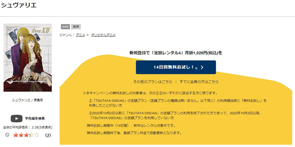 TSUTAYA DISCASは、準新作は8枚まで、話題作・旧作は枚数制限なしでお試し期間中に無料レンタルができ「シュヴァリエ 〜Le Chevalier D’Eon〜」のアニメは、旧作なので無料視聴可能です。