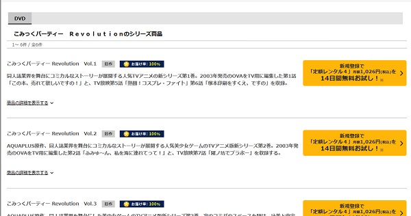 動画配信サービスとは少し違い、DVDレンタルサービスになりお試し期間で、「こみっくパーティー Revolution」の動画を全話視聴することができます。