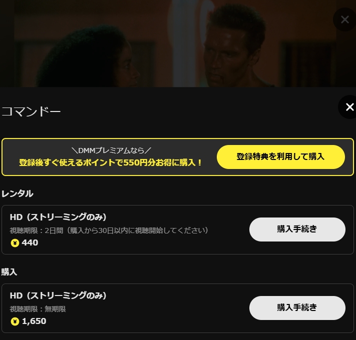 中でも、おすすめなのはDMM TVです。31初回登録後すぐにもらえる550円分のポイントを利用すれば、440円でレンタルできる映画「コマンドー」を追加料金なしでフル視聴できます。