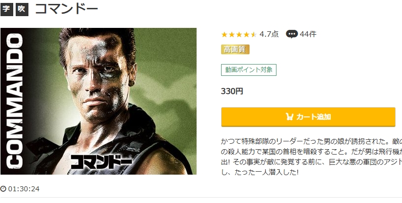 初回登録時に1,600円分のポイントがもらえるので、330ポイントでレンタル配信している映画「コマンドー」は無料で視聴できます。