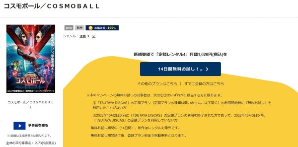 そして、映画「コスモボール」はツタヤディスカスで配信しているので、無料でDVDレンタルが可能です。