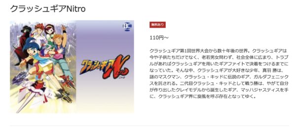 ただ、アニメ「クラッシュギアNitro」の関連作品やシリーズ作品は配信しているので、有料となってしまいますが見放題で視聴は可能です。
