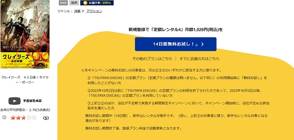 ツタヤディスカスは、準新作・話題作・旧作が8枚までなら、無料お試し期間中にレンタルができるので、「クレイジーズ 42日後」の映画を無料で視聴した後も30日間以内なら他のシリーズ作品や見たかった映画も無料でレンタルすることができますよ。