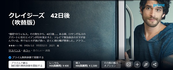映画「クレイジーズ 42日後」はAmazonプライムビデオでもフルで視聴することができます。
