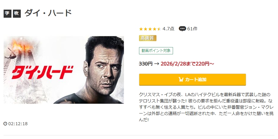 初回登録時に1,600円分のポイントがもらえるので、330ポイントでレンタル配信している映画「ダイ・ハード」は無料で視聴できます。
