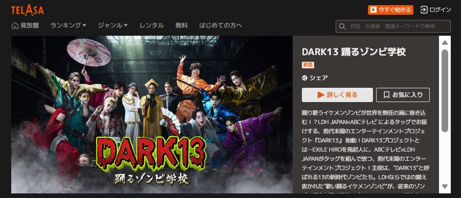 TELASAでは「DARK13 踊るゾンビ学校」のドラマが見放題配信の対象作品になっているので、全話見放題で視聴できます。