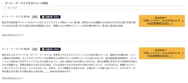 TSUTAYA DISCASは、準新作は8枚まで、話題作・旧作は枚数制限なしでお試し期間中に無料レンタルができ「デート・ア・ライブ 2期」のアニメは、旧作なので無料視聴可能です。