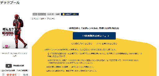 『TSUTAYA DISCAS』は14日間のお試し期間が初回特典で利用できるので「デッドプール」の動画をフルで無料視聴できますよ。