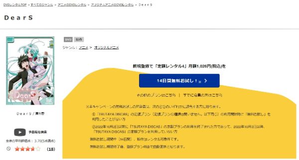 TSUTAYA DISCASは、準新作は8枚まで、話題作・旧作は枚数制限なしでお試し期間中に無料レンタルができ「DearS」のアニメは、旧作なので無料視聴可能です。