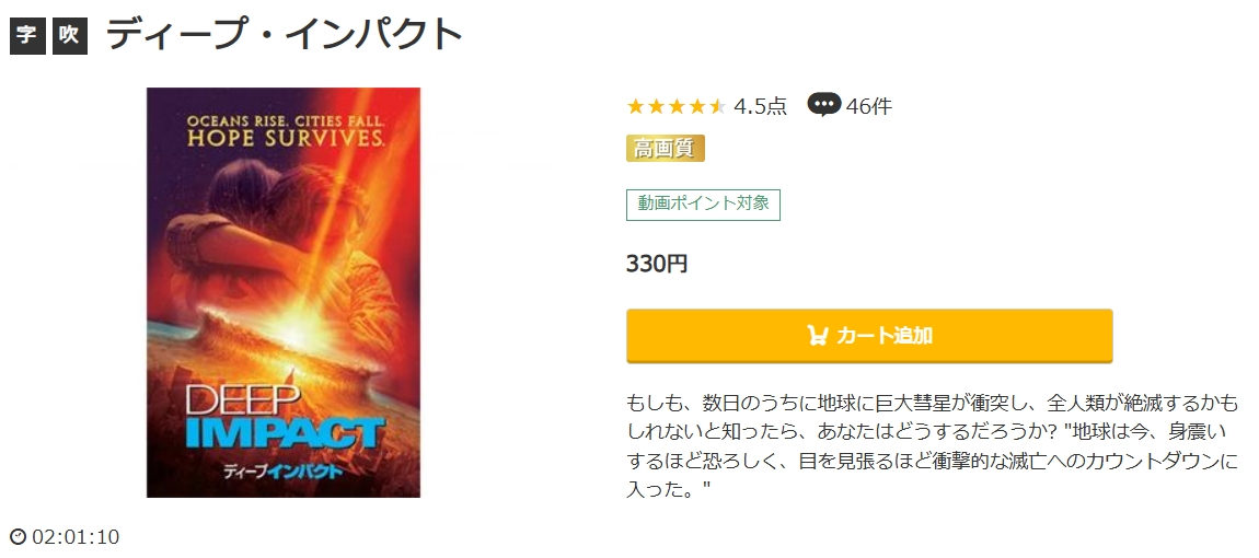 初回登録時に1,600円分のポイントがもらえるので、330ポイントでレンタル配信している映画「ディープ・インパクト」はフルで視聴できます。