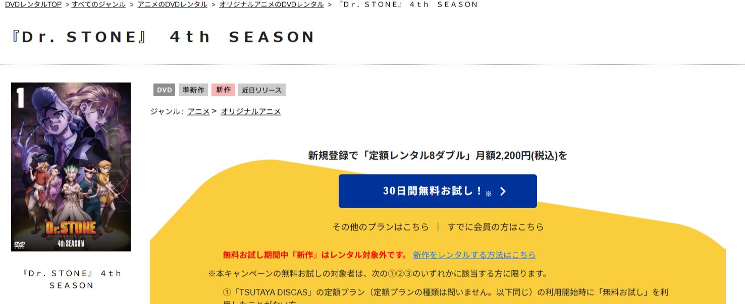 このDVDレンタルサービスを使うことで、DVDを自宅に取り寄せて、アニメ「Dr.STONE SCIENCE FUTURE 4期(第1クール)」を視聴可能です。