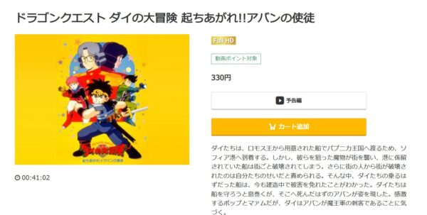 映画「ドラゴンクエスト ダイの大冒険 起ちあがれ!!アバンの使徒」の動画は330円でレンタル配信してるので、フルで無料視聴できます。
