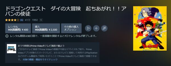 しかし、Amazonプライムビデオは無料期間が30日間ありますが、「ドラゴンクエスト ダイの大冒険 起ちあがれ!!アバンの使徒」の映画はレンタル作品で400円かかってしまうため無料視聴することができません。