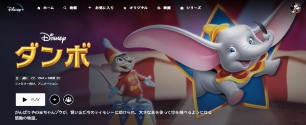 ただ、映画「ダンボ」の動画は視聴できないので、ダンボを見たい場合はディズニープラスをお試しください。