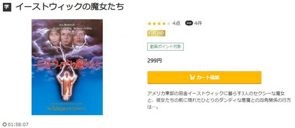映画「イーストウィックの魔女たち」は299円でレンタル配信してるので、フルで視聴できます。