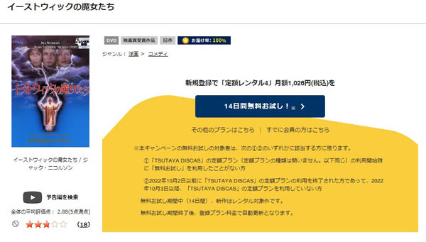 そして、映画「イーストウィックの魔女たち」はツタヤディスカスで配信しているので、無料でDVDレンタルが可能です。
