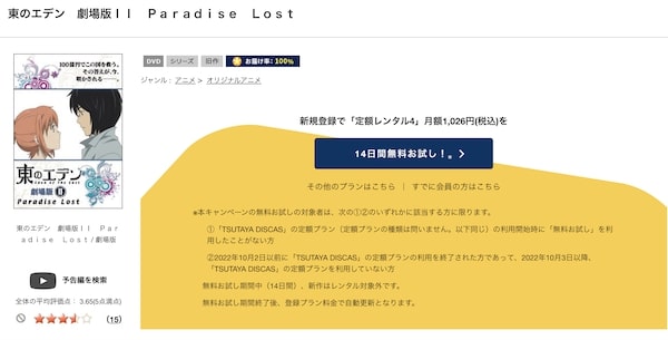 そして、映画「東のエデン 劇場版II Paradise Lost」はツタヤディスカスで配信しているので、無料でDVDレンタルが可能です。