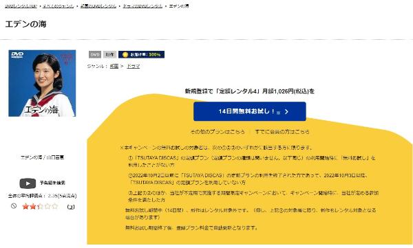 そして、映画「エデンの海」はツタヤディスカスで配信しているので、無料でDVDレンタルが可能です。