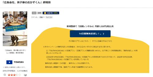 そして、映画「劇場版 広告会社、男子寮のおかずくん」はツタヤディスカスで配信しているので、無料でDVDレンタルが可能です。