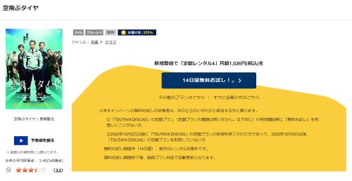 ツタヤディスカスは、準新作・話題作・旧作が4枚までなら、無料お試し期間中にレンタルができるので、「空飛ぶタイヤ」の映画を無料で視聴した後も14日間以内なら他のシリーズ作品や見たかった映画も無料でレンタルすることができますよ。