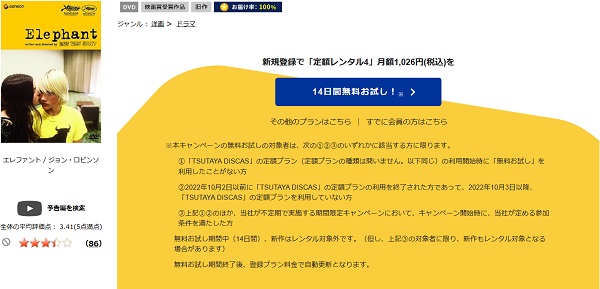 そして、映画「エレファント」はツタヤディスカスで配信しているので、無料でDVDレンタルが可能です。