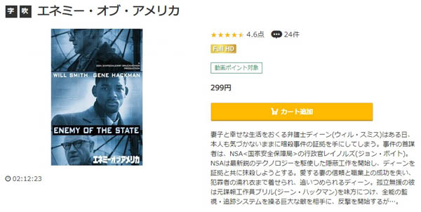 映画「エネミー・オブ・アメリカ」は299円でレンタル配信してるので、フルで視聴できます。