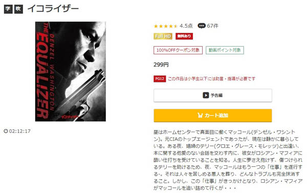 映画「イコライザー」は299円でレンタル配信してるので、フルで視聴できます。