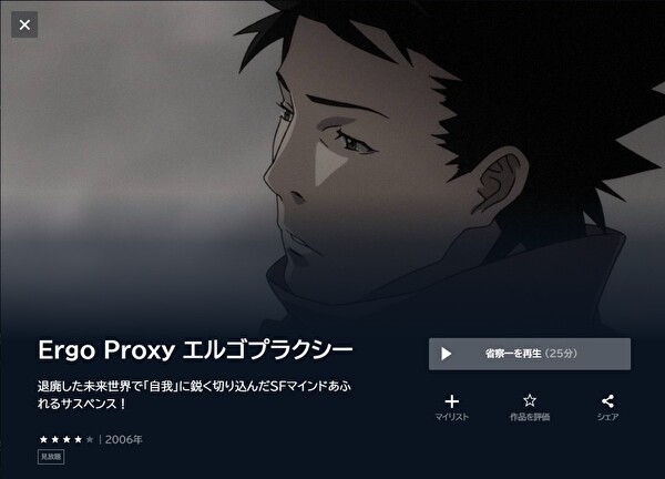 - 「Ergo Proxy(エルゴプラクシー)」の関連動画も無料で視聴できる。