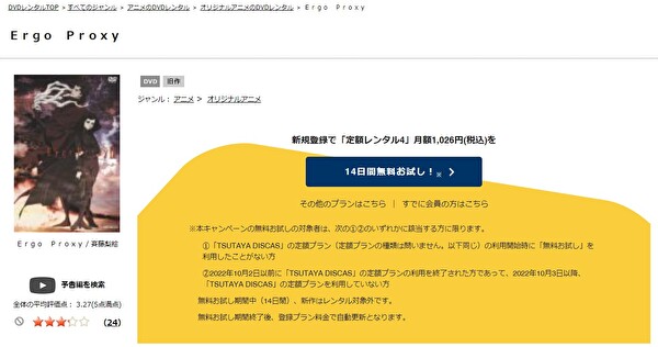 TSUTAYA DISCASは、準新作は8枚まで、話題作・旧作は枚数制限なしでお試し期間中に無料レンタルができ「Ergo Proxy(エルゴプラクシー)」のアニメは、旧作なので無料視聴可能です。