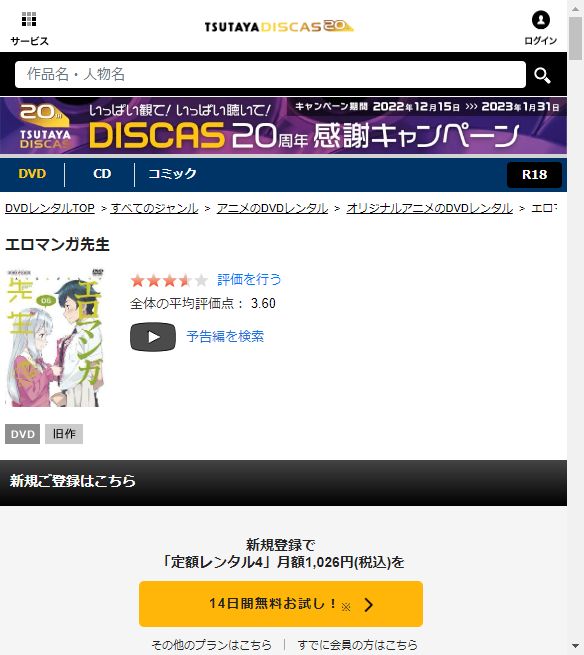 TSUTAYA DISCASは、準新作は8枚まで、話題作・旧作は枚数制限なしでお試し期間中に無料レンタルができ「エロマンガ先生」のアニメは、旧作なので無料視聴可能です。