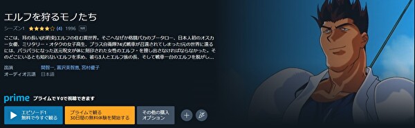 Amazonプライムでも、アニメ「エルフを狩るモノたち(1期)」は見放題で配信されており、30日間の無料期間があるので、余裕を持って「エルフを狩るモノたち(1期)」のアニメを全話視聴ができます。