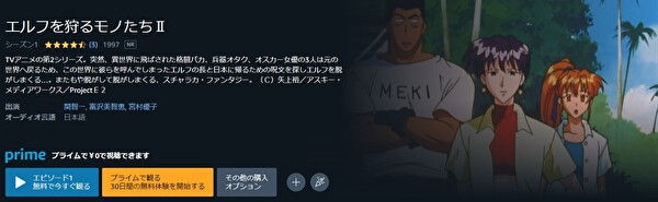 Amazonプライムはアニメ「エルフを狩るモノたちII(2期)」は無料で視聴できませんが、関連動画やシリーズ作品には見放題で配信されているものもあります。
