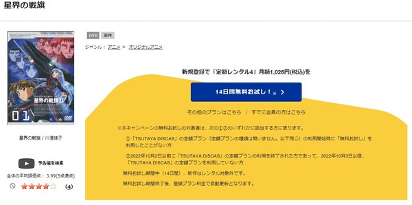 TSUTAYA DISCASは、準新作は8枚まで、話題作・旧作は枚数制限なしでお試し期間中に無料レンタルができ「星界の戦旗II」のアニメは、旧作なので無料視聴可能です。