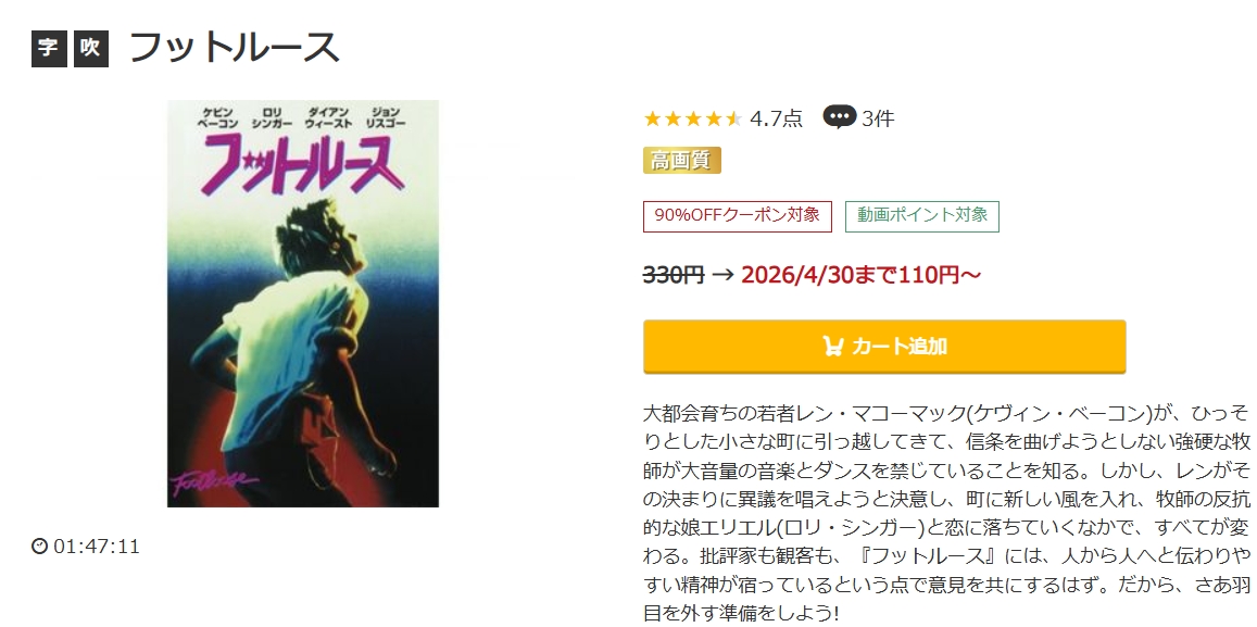 初回登録時に1,600円分のポイントがもらえるので、110ポイントでレンタル配信している映画「フットルース」はフルで視聴できます。(※2026年4月時点)
