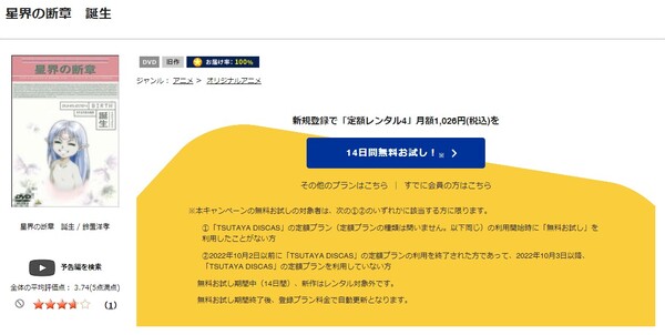 TSUTAYA DISCASは、準新作は8枚まで、話題作・旧作は枚数制限なしでお試し期間中に無料レンタルができ「星界の断章 -誕生-」のアニメは、旧作なので無料視聴可能です。