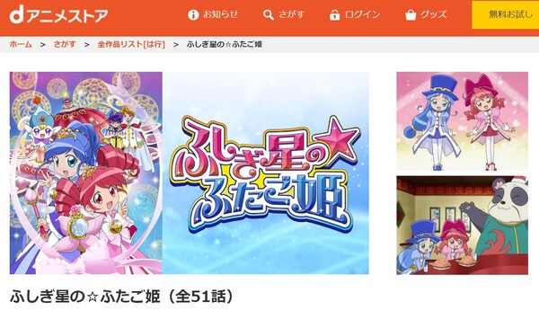 またdアニメストアは、アニメ「ふしぎ星の☆ふたご姫」のシリーズや関連動画を全話視聴できます。