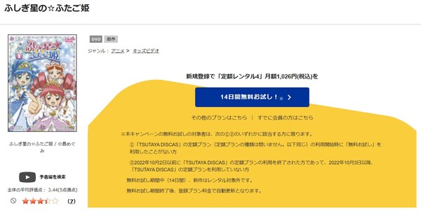 TSUTAYA DISCASは、準新作は8枚まで、話題作・旧作は枚数制限なしでお試し期間中に無料レンタルができ「ふしぎ星の☆ふたご姫」のアニメは、旧作なので無料視聴可能です。