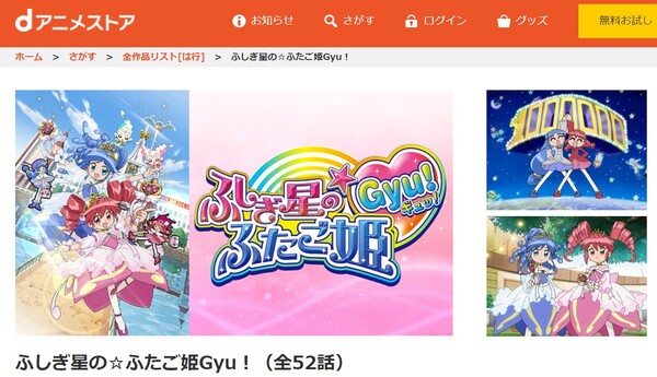 またdアニメストアは、アニメ「ふしぎ星の☆ふたご姫 Gyu!」のシリーズや関連動画を全話視聴できます。